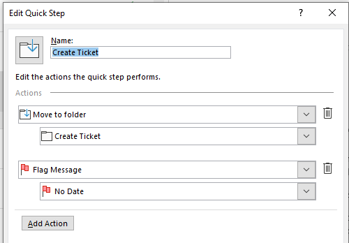 So I created a Quick Action in Outlook – the quick action first moves the email to a ‘Create Ticket’ folder then flags the email.